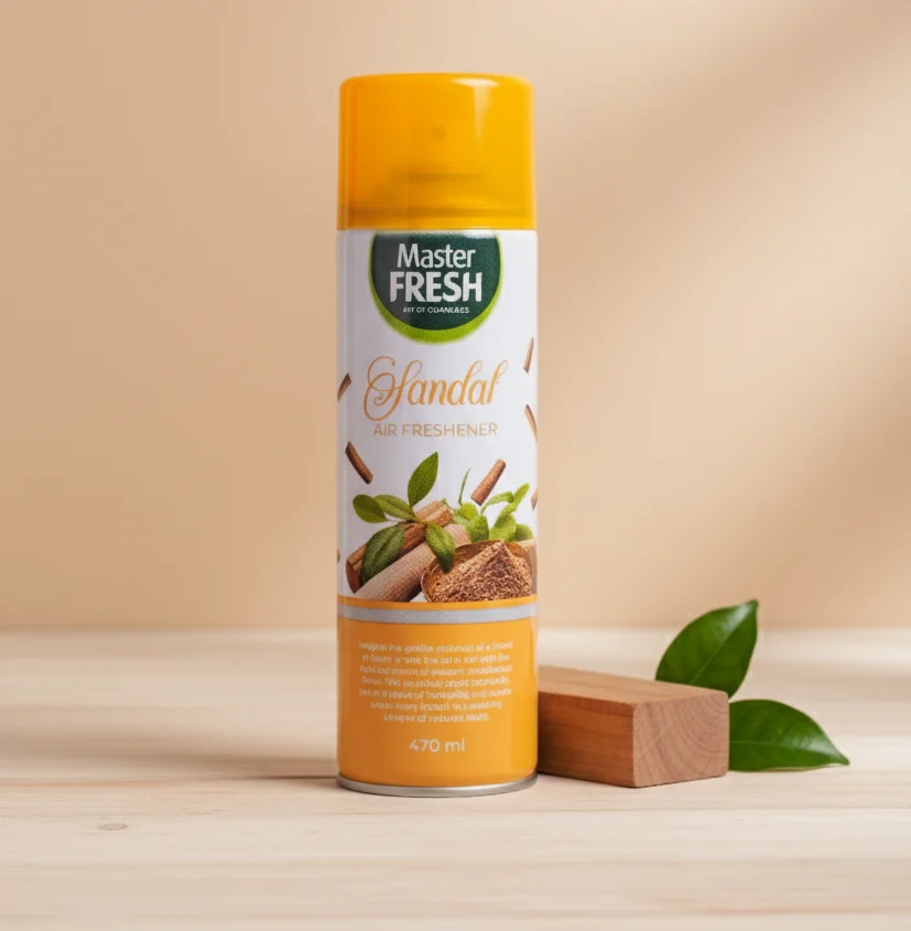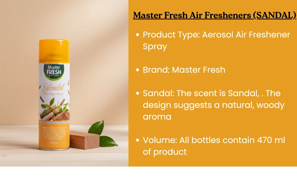 Indulge your senses with the rich, soothing scent of the Master Fresh Sandal Air Freshener Spray. This premium room freshener, packaged in a substantial 470 ml aerosol can, is designed to create a warm, tranquil, and long-lasting atmosphere in your home.